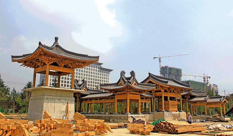 8月14日,记者在铜川书画公园项目建设现场看到,书画长廊、笔墨纸砚塔楼、照壁等建筑已初具雏形,林立园中。现场施工人员正在紧张有序开展工作,全力推进项目建设进度。预计今年年底将全面完成项目建设,届时铜川书画公园将成为我市又一道靓丽风景。