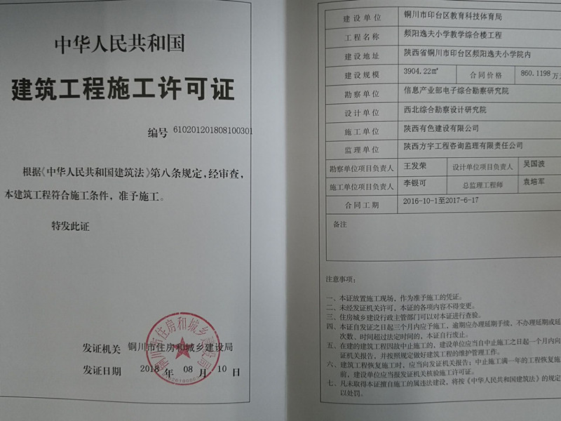 标题:频阳逸夫小学教学综合楼工程建筑工程施工许可证, 正文: