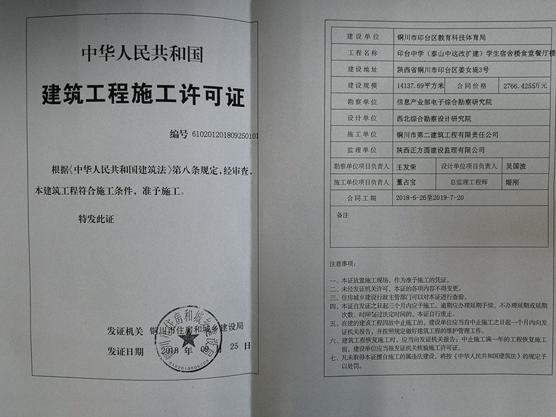 印台中学学生宿舍楼食堂餐厅楼建筑工程施工许可证