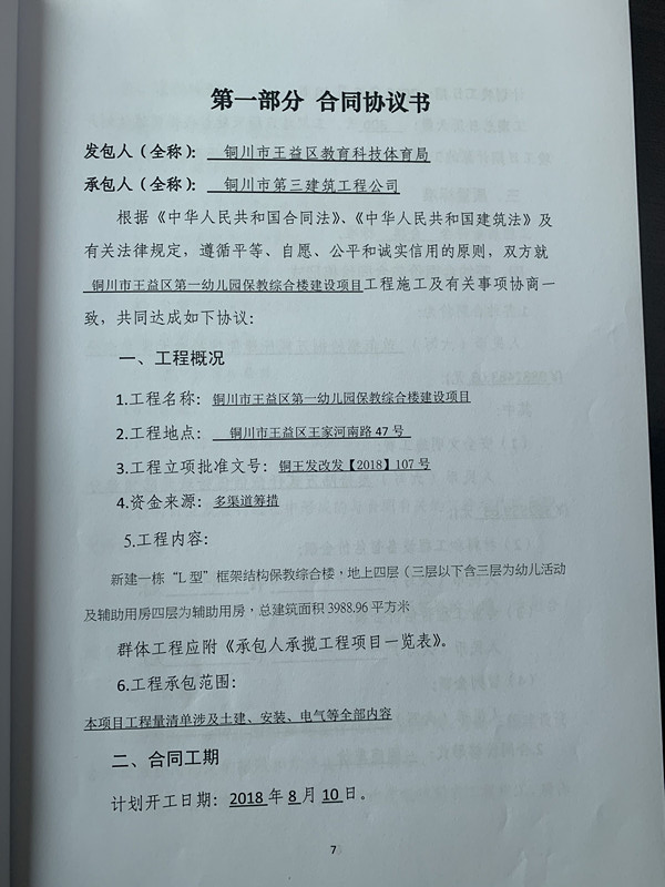 标题:王益区第一幼儿园保教综合楼项目建设工程施工合同, 正文: