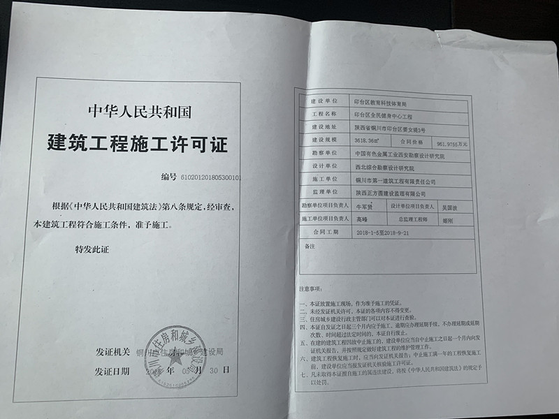 标题:印台区全民健身中心工程建筑工程施工许可证, 正文: