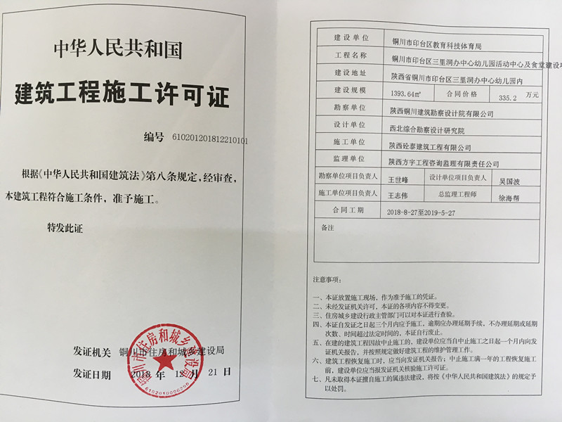 标题:印台区三里洞办中心幼儿园活动中心及食堂建设项目建筑工程施工许可证, 正文: