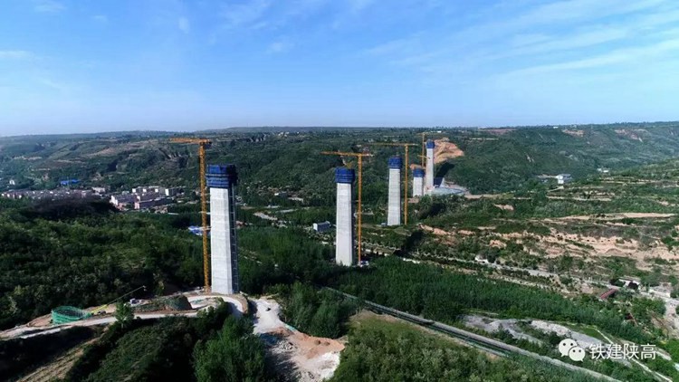 王家河特大桥集大跨度连续刚构施工、索塔施工、斜拉索施工技术,技术复杂、施工难度大、安全风险大,是目前陕西省境内最大跨径的的斜拉桥。桥址区域为黄土台塬地貌,桥梁全长2030米,其中主桥为五塔六跨预应力混凝土矮塔斜拉桥,主桥跨度为230 米的有4跨,主桥全长1170 米;引桥采用装配式预应力混凝土连续T 梁,全长860米;主墩采用双薄壁空心墩,整体成八边形形状,墩高超过百米桥墩有5座,最大墩高144 米;墩柱、梁、索塔总高度最高达188.5m。本次率先封顶的14号主墩高120米。