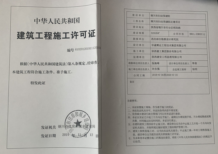 铜川市妇幼保健院迁建项目建筑工程施工许可证