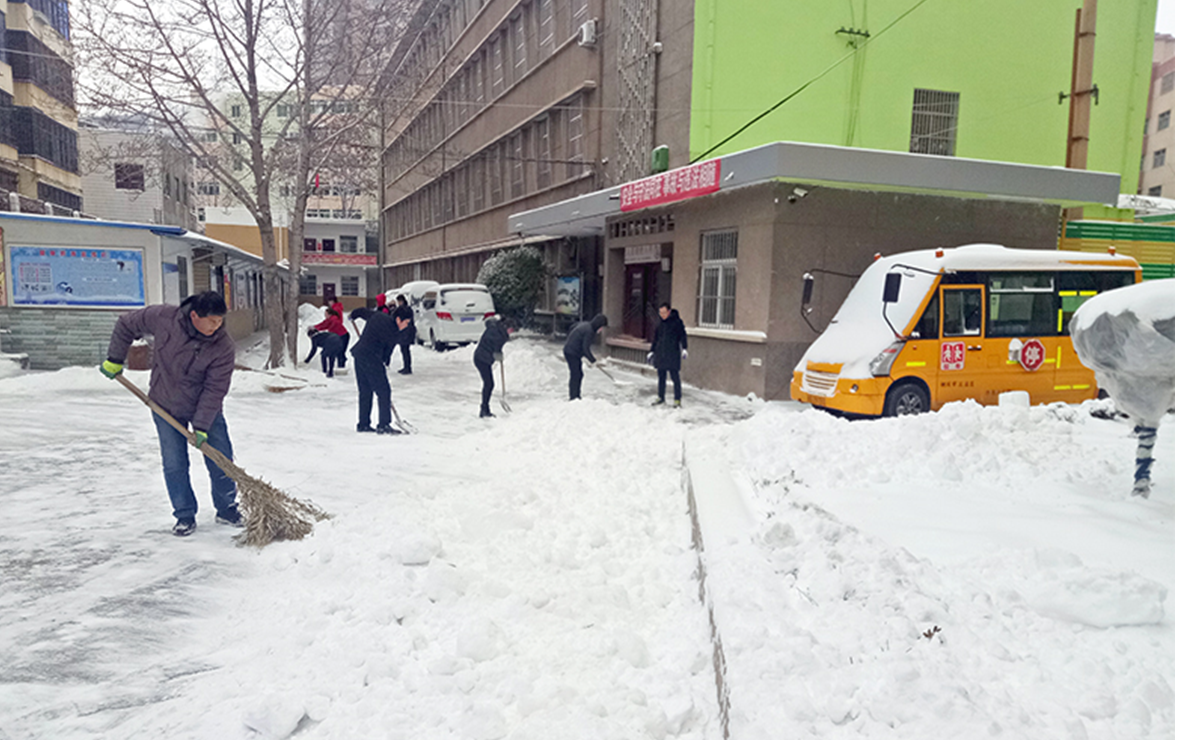 干部职工自发对单位院内各个区域、大门口积雪进行了除扫,确保道路畅通,职工安全上下班。(大兴制衣公司)