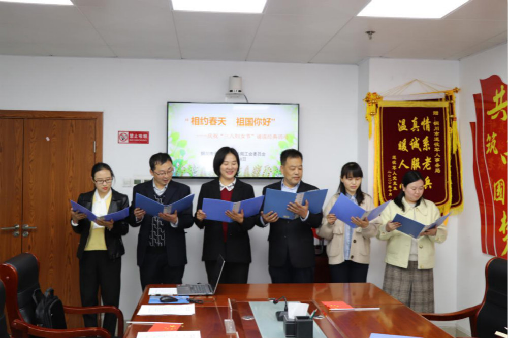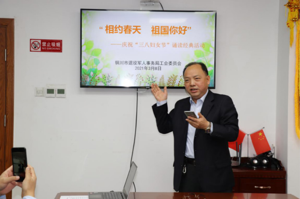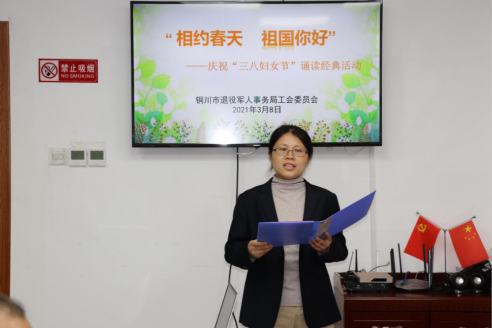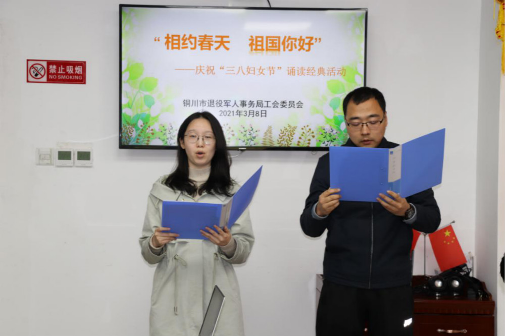 为开展好2021年“三八”国际妇女节活动,迎接中国共产党成立100周年,市退役军人事务局工会委员会举行了主题为“相约春天 祖国你好”诵读经典活动。全体工会会员参加了本次活动。