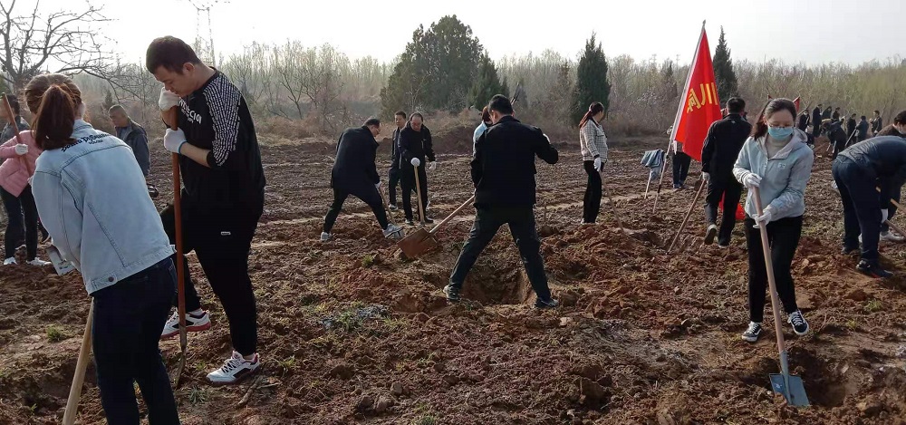 在植树现场,大家相互配合,挖坑、铲土,丈量株距,认真做好每一道工序,现场一派热火朝天的景象。