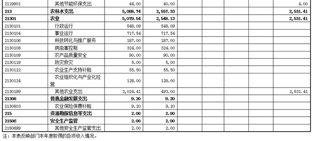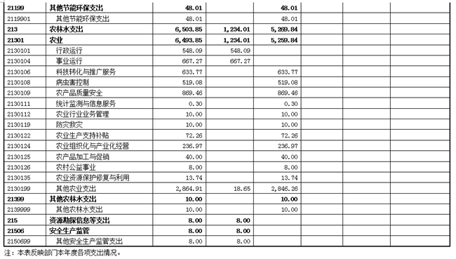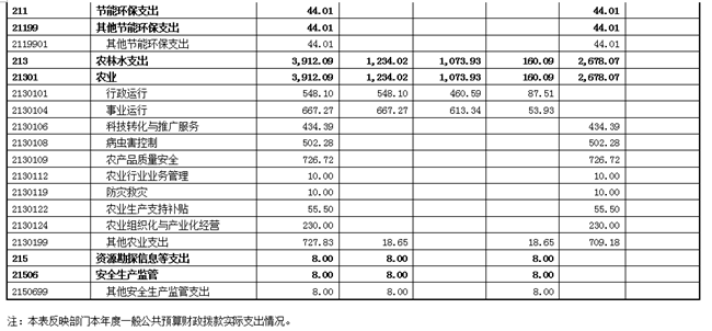 一般公共服务支出37.94万元(主要是公务员考核37.2万元、其他组织事务支出0.74万元)、科学技术支出30万元(主要是其他科技条件与服务支出)、社会保障和就业支出20.76万元(主要是死亡抚恤)、医疗卫生与计划生育支出46.87万元(主要是行政单位医疗19.74万元、事业单位医疗27.13万元)、节能环保支出44.01万元(主要是其他节能环保支出)、农林水支出3912.09万元(主要是行政运行548.1万元、事业运行667.27万元、科技转化与推广服务434.39万元、病虫害控制502.28万元、农产品质量安全726.72万元、农业行业业务管理10万元、防灾救灾10万元、农业生产支持补贴55.5万元、农业组织化与产业化经营230万元、其他农业支出727.83万元)、资源勘探信息等支出8万元(主要是其他安全生产监管支出)