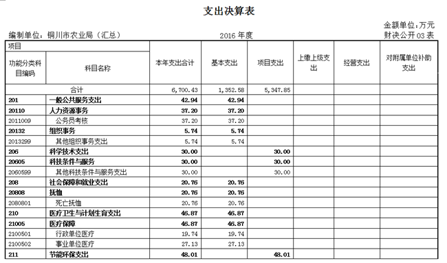 2016年度本年支出合计6700.42万元(农业局机关及17家基层单位合计支出)。其中: