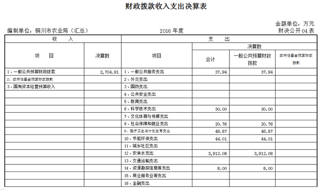 (1)2016年度本年财政拨款收入合计2704.91万元(为农业局机关及17家基层单位合计收入),较上年减少316.78万元,主要原因是当年财政拨款减少。