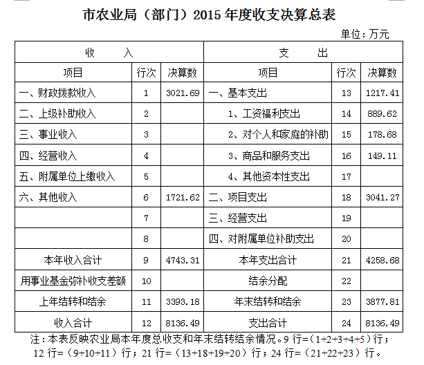1、收入总计8136.49万元(为农业局机关及17家基层单位合计收入)。包括:财政拨款收入3021.69万元;其他收入1721.62万元(其中省市专项资金通过局机关拨所属17家基层单位项目资金1328.78万元,为市局汇总时重复计算收入);上年结转和结余3393.18万元(为跨年度项目工作结转资金,于2015年已实施完成)。