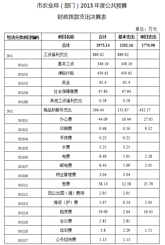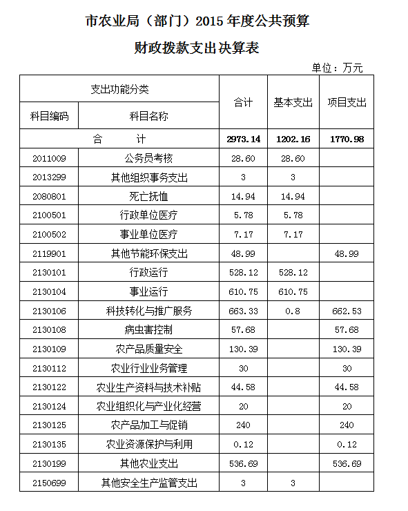 2015年公共预算财政拨款支出2973.14万元(含机关及17个基层二级单位),其中:公务员考核支出28.6万元、其他组织事务支出3万元,死亡抚恤支出14.94万元,行政单位医疗支出5.78万元,事业单位医疗支出7.17万元,其他节能环保支出48.99万元,行政运行支出528.12万元,事业运行支出610.75万元,科技转化与推广服务支出663.33万元,病虫害控制支出57.68万元,农产品质量安全支出130.39万元,农业行业业务管理支出30万元,农业生产资料与技术补贴支出44.58万元,农业组织化与产业化经营20万元,农产品加工与促销240万元,农业资源保护与利用0.12万元,其他农业支出536.69万元,其他安全生产监管支出3万元。