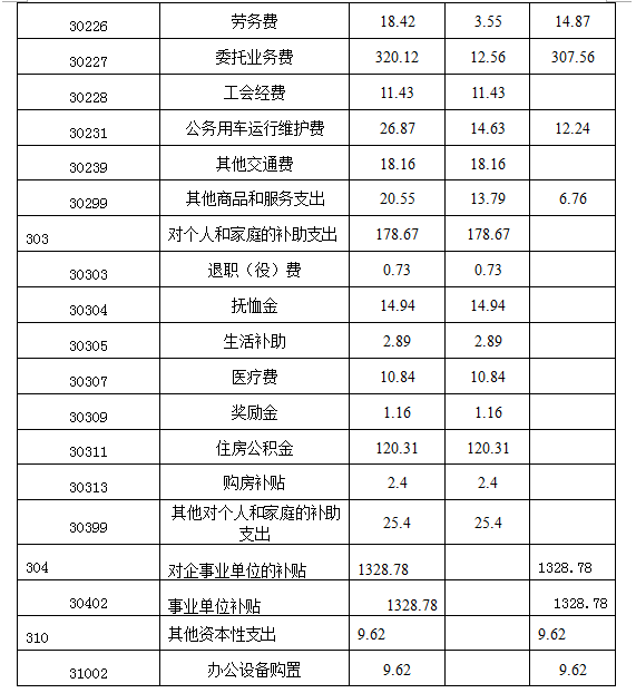 (2)商品和服务支出566.44万元(办公费44.09万元,印刷费9.48万元,手续费0.22万元,水费3.25万元,电费8.49万元,邮电费8.44万元,物业管理费3.04万元,差费38.14万元,因公出国(境)费用2.95万元,维修(护)费5.97万元,租赁费19.09万元,会议费2.81万元,培训费3.8万元,公务招待费1.13万元,劳务费18.42万元,委托业务费320.12万元,工会经费11.43万元,公务用车运行维护费26.87万元,其他交通费18.16万元,其他商品和服务支出20.55万元)。