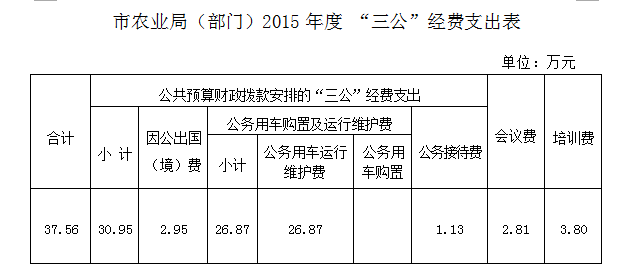 2015年度公共预算财政拨款安排的“三公经费”支出及会议、培训费共计30.95万元(市局及17家基层单位合计支出),其中,因公出国(境)2.95万元,公务用车购置及运行维护费26.87万元(为公务用车运行维护费26.87万元),公务接待费1.13万元,会议费2.81万元,培训费3.80万元。